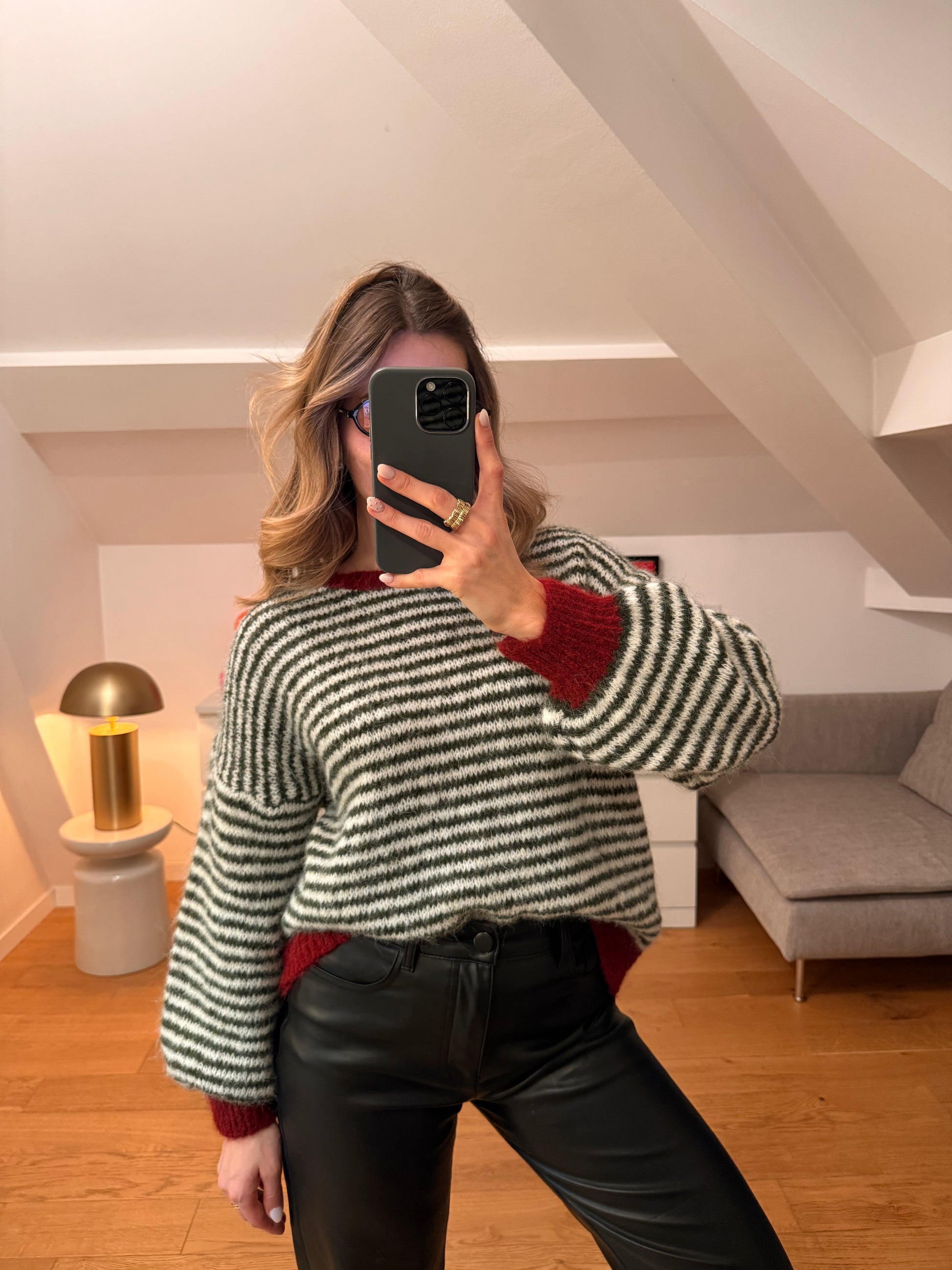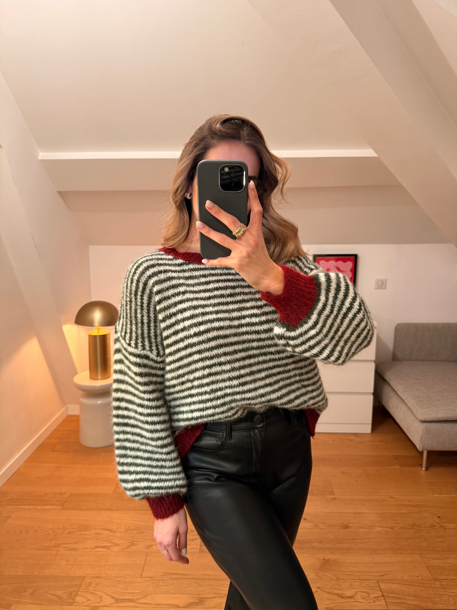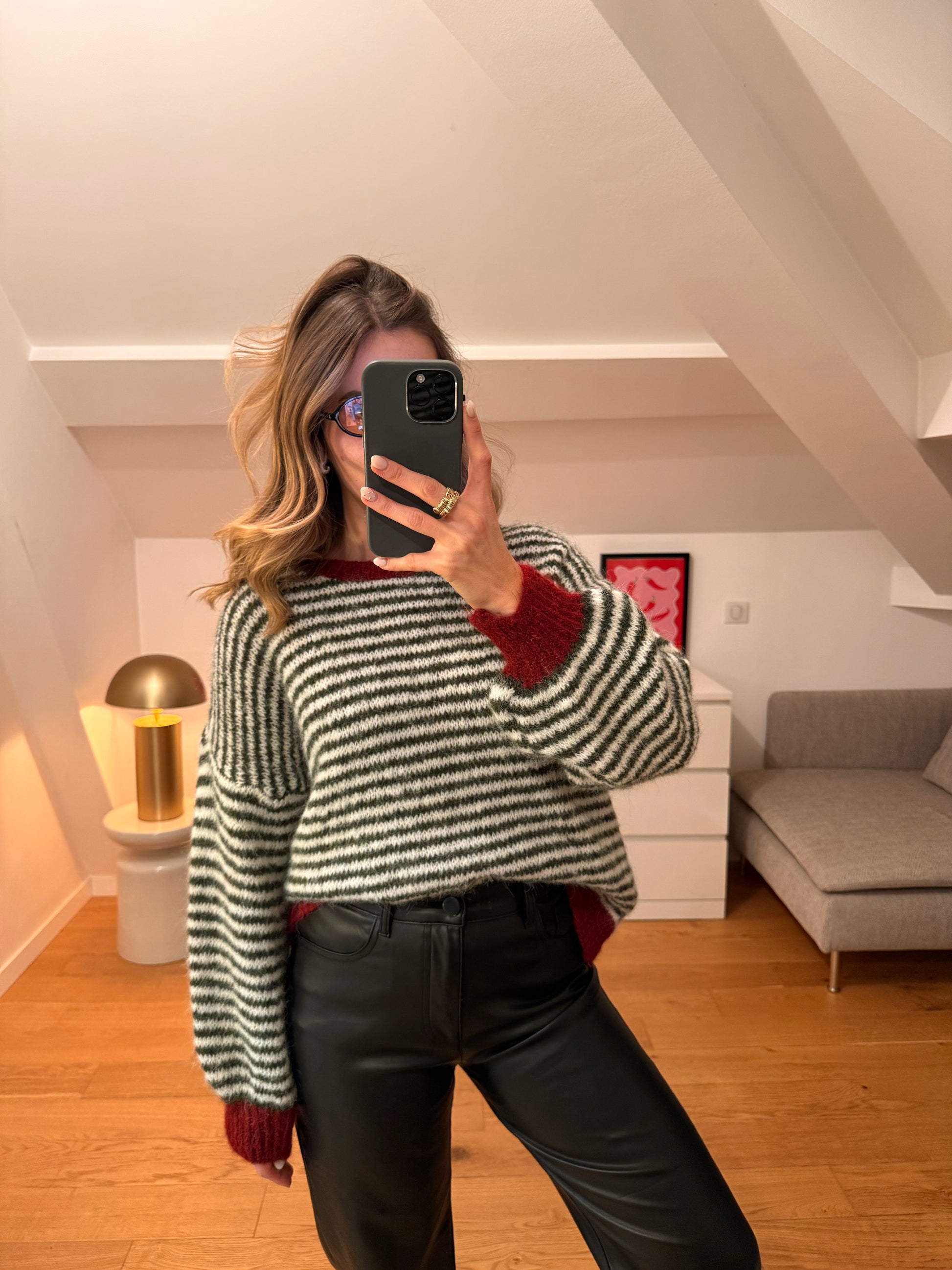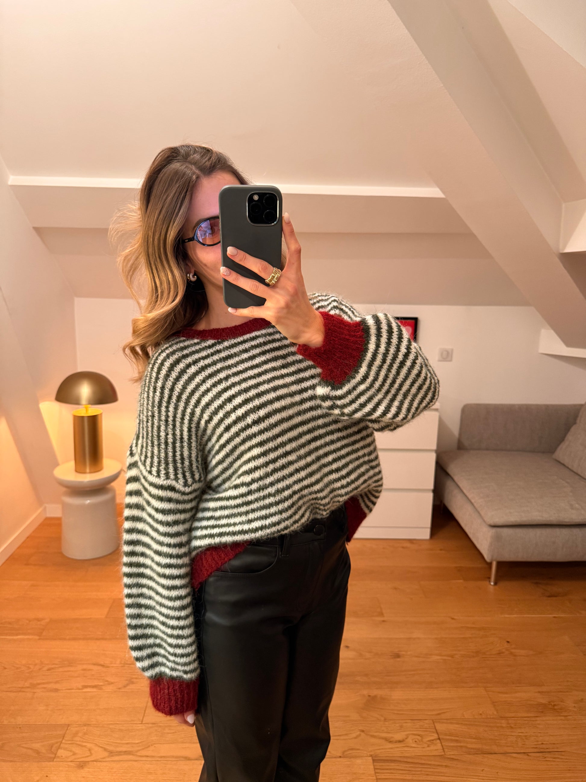 - Pull ligné kaki, blanc et bordeaux
